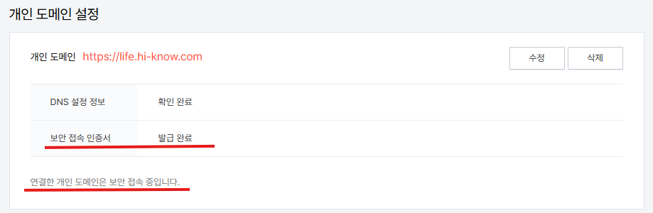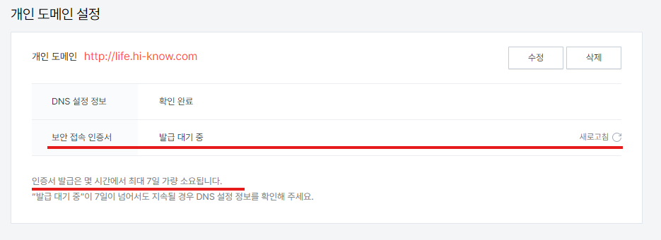 - 보안 접속 인증서 : 발급대기중 표시의 경우 시간이 지나면 "발급 완료" 표기 됩니다. (약 2~4시간 정도 소요 되었던것 같음.)