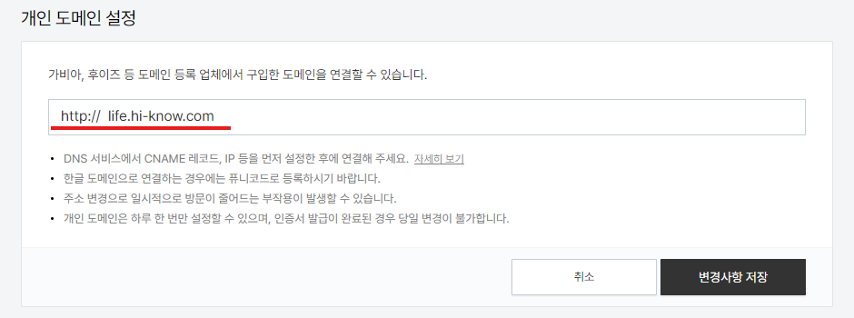 ex> 저는 앞서 "life"로 등록한 관계로 life.hi-know.com으로 기록 처리 하였습니다.