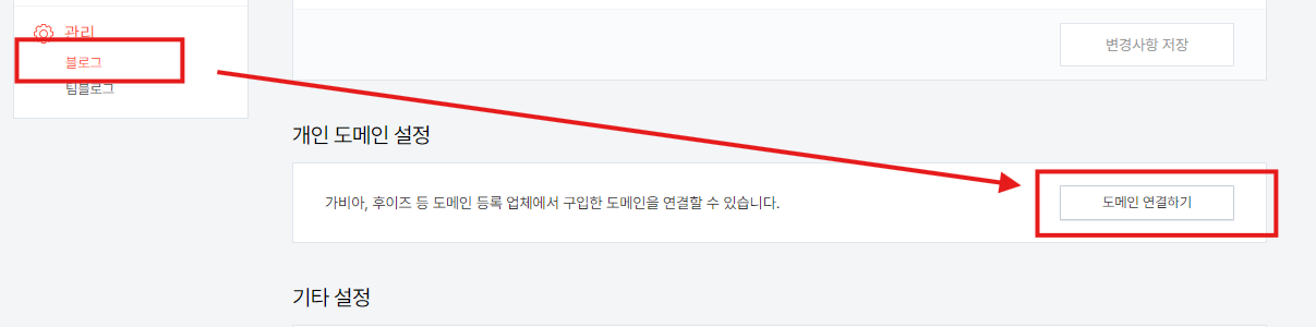- 계정의 블로그 설정으로 이동후 블로그 항목에서 "도메인 연결하기" 항목을 선택합니다.