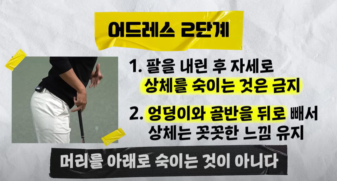 박하림 프로님은 "어드레스를 잘못 잡으면 스윙도 잘못된 방향으로 가게 된다"고 하셨어요. 만약 상체를 너무 숙여서 골반이 앞쪽으로 가면, 스윙 중에 클럽이 엉뚱한 방향으로 나가게 되죠. 따라서 어드레스 때부터 골반과 엉덩이를 뒤로 빼는 것이 매우 중요합니다.