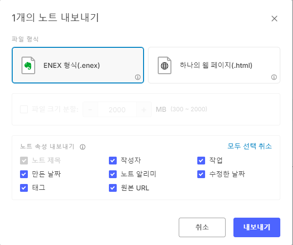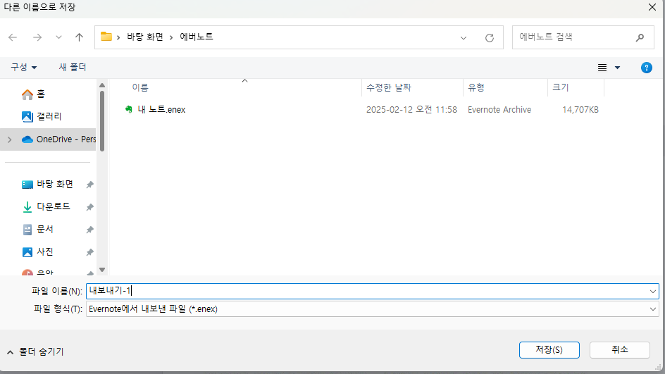 에버노트에서 내보내기 형식은 당연히 ENEX 형식으로 선택 해주시고 폴더 지정 및 파일 이름을 작성합니다.