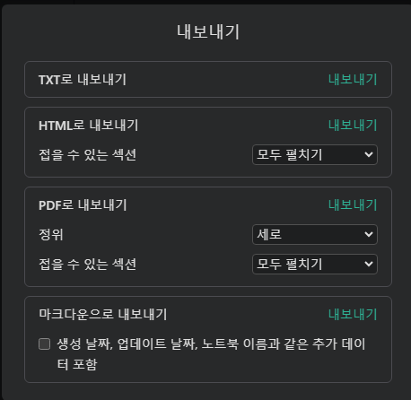 아래 그림과 같이 팝업창에 마크다운으로 내보니기 "내보내기"를 선택 해주시면 폴더를 지정 하라고 표시 됩니다.