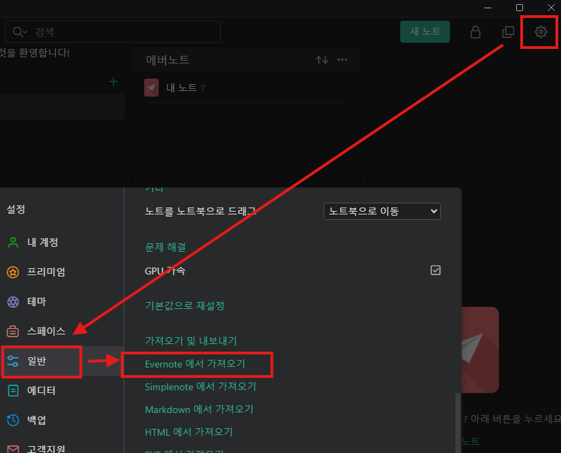 1. 설정 -> 일반 -> Evernote가져오기 선택합니다.
