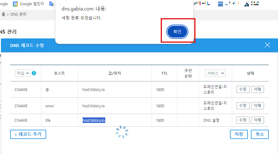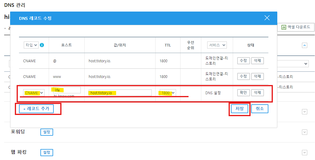 - "레코드 추가" 버튼 클릭후 DNS 레코드 정보를 입력후 상태란에 "확인"버튼 클릭후 "저장" 버튼을 클릭합니다.