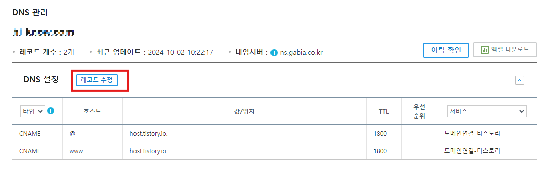- DNS설정 항목내에 "레코드 수정" 버튼을 클릭 합니다.