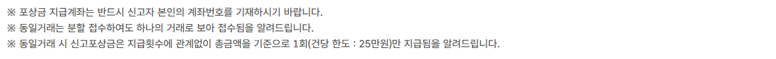 또한 한 사람이 1년에 받을 수 있는 최대 포상금은 100만 원입니다. 그리고 1,000원 미만 포상금은 지급되지 않는다는 점도 함께 기억해 두면 좋습니다.